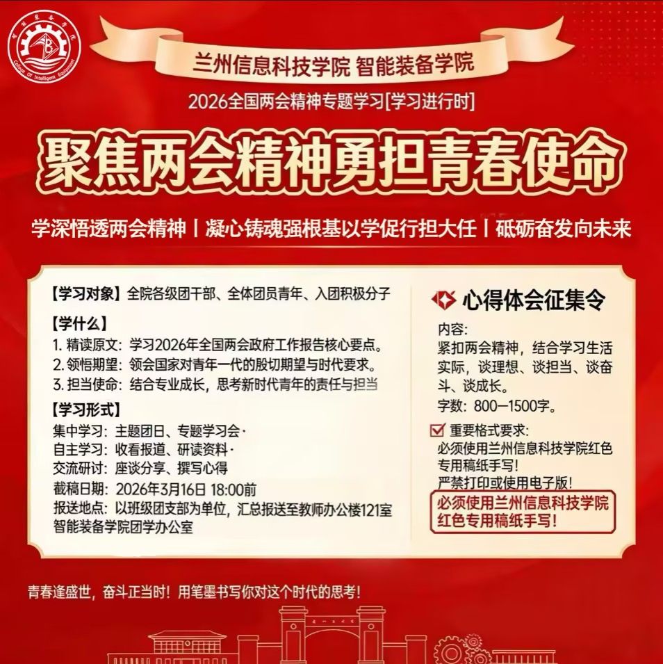 为深入学习贯彻2026 年全国两会精神,引导青年学子凝心铸魂,勇担青春使命,3月13日,兰州信息科技学院智能装备学院组织开展 “聚焦两会精神 勇担青春使命”专题学习系列活动,全院各级团干部、全体团员青年及入团积极分子参与学习。