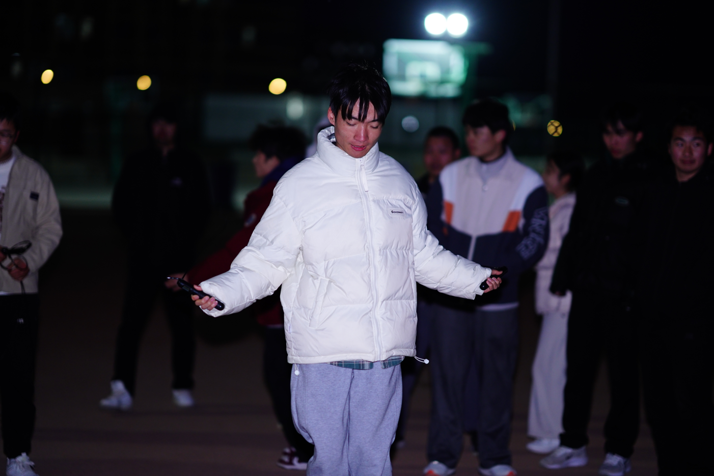 随着裁判一声哨响,比赛正式拉开帷幕。本次比赛以9人为一组,参赛队员迅速站位、默契配合,长绳在队员手中飞速翻飞,划出一道道灵动的弧线。队员们步伐整齐划一,节奏精准统一,每一次腾空跳跃都充满力量,每一次落地都沉稳坚定,绳穗扫过地面发出的“唰唰”声,与场边同学们的呐喊助威声、掌声交织在一起,奏响了激昂奋进的青春乐章。