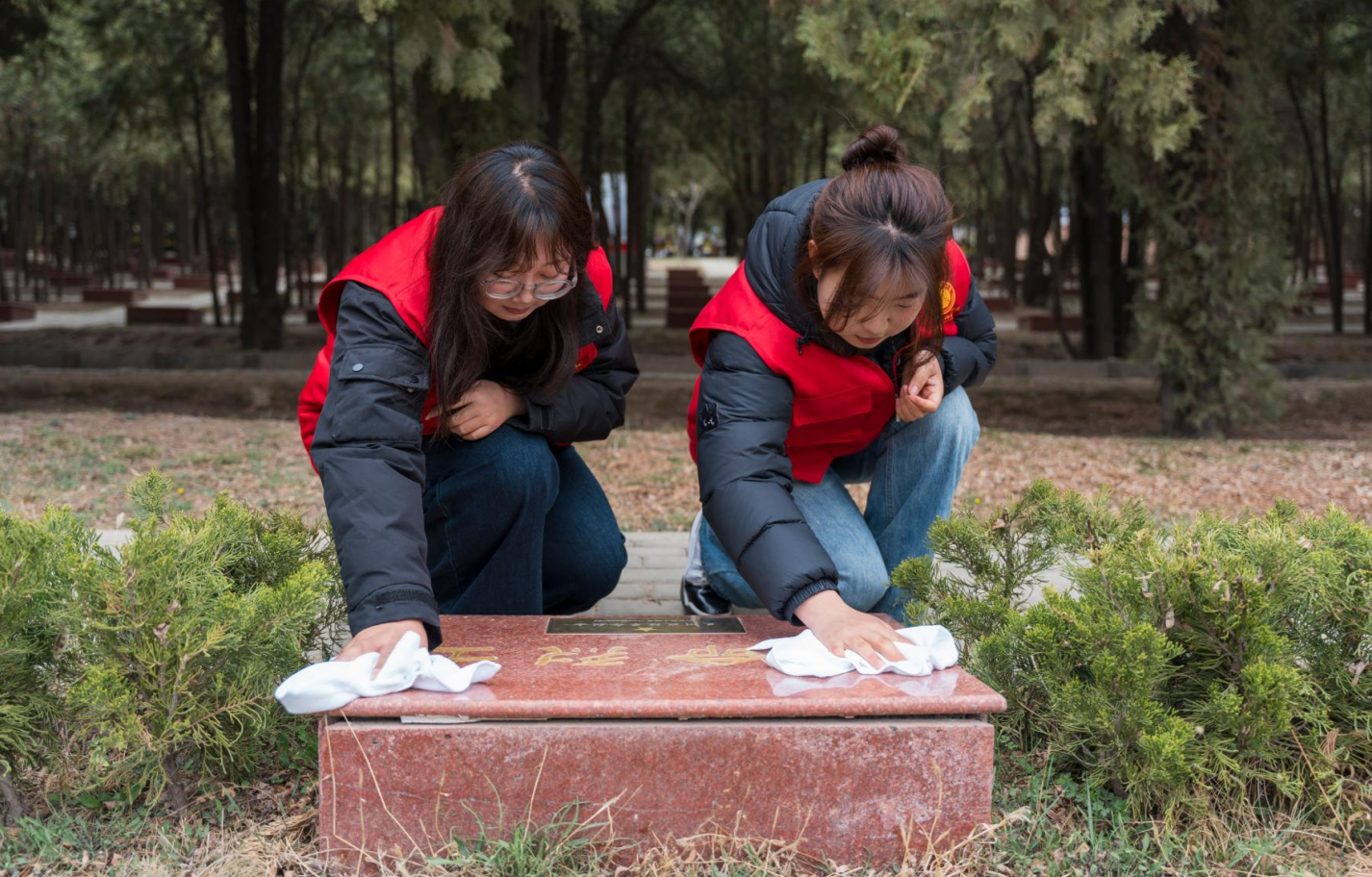 默哀礼成,在党员教师的带领下,大家前往烈士墓区祭扫。同学们手持清洁工具擦拭斑驳墓碑、清理碑前杂物,逐一鞠躬致意,以朴素而虔诚的行动告慰英烈忠魂。清扫过程中,党员同志主动为身边团员青年讲述英烈事迹,教师代表现场补充历史背景,让红色故事在实践中传递,让革命精神在党团互动中赓续传承。