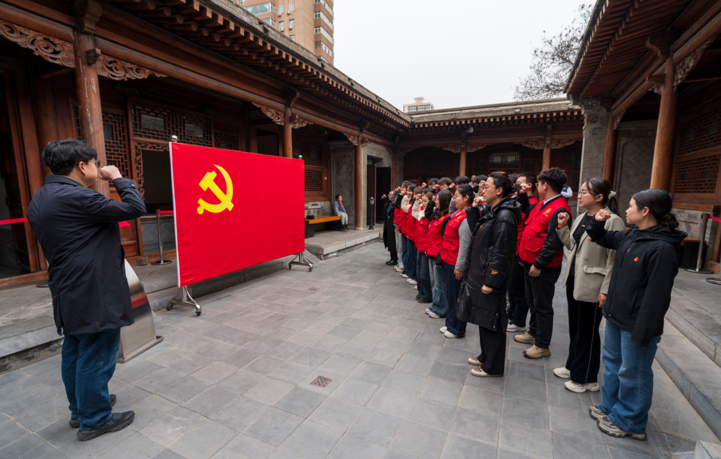 展厅内党旗高悬,苗国涛老师带领全体党员及随行教师面向党旗庄严列队,高举右拳,共同重温入党誓词,以铮铮誓言叩问初心、践行使命;团员青年在旁肃立聆听,感受党员的责任与担当,进一步坚定向党组织靠拢的决心,彰显党建带团建、党团共成长的鲜明导向。