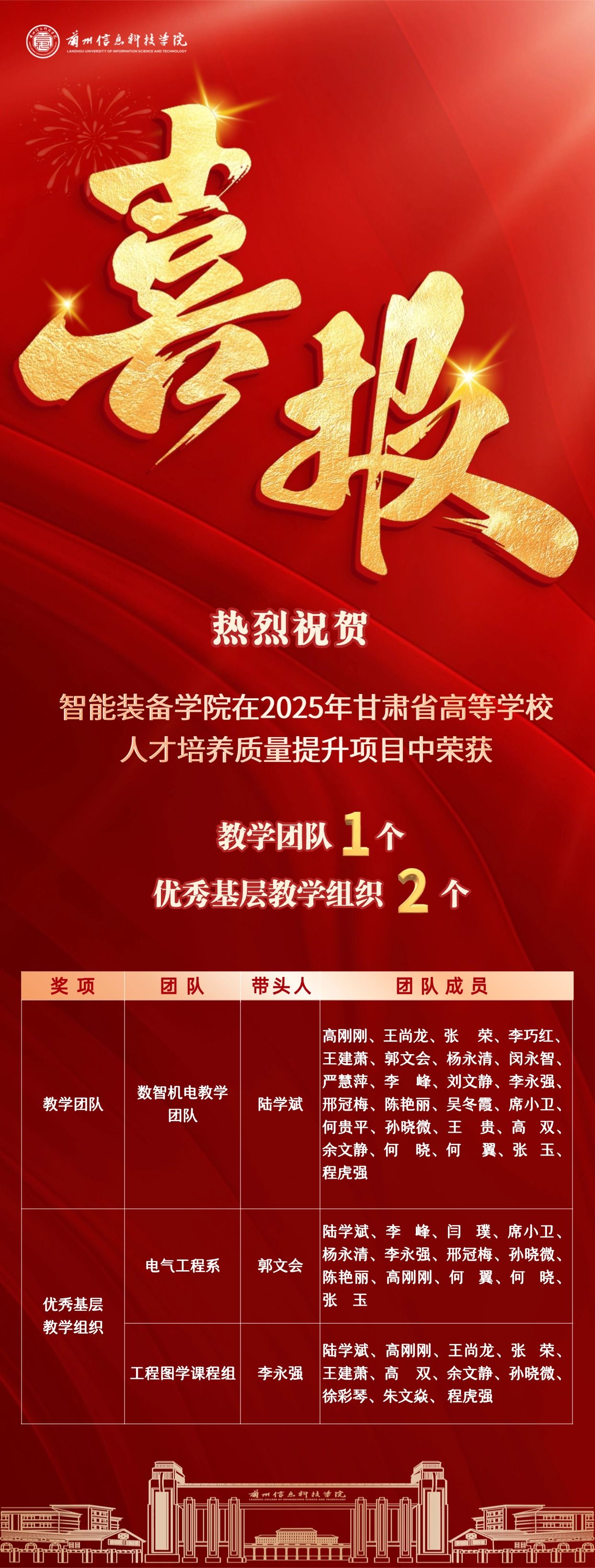 热烈祝贺智能装备学院数智机电教学团队荣获2025年甘肃省高等学校人才培养质量提升教学团队,电气工程系、工程图学课程组荣获2025年甘肃省高等学校人才培养质量提升优秀基层教学组织!